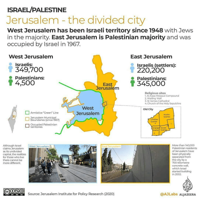 تصویر زیر تقسیم بندی دقیق قدس شرقی و غربی و هچنین محل قدس قدیم یا تاریخی که مسجدالاقصی بخشی از آن است، نشان میدهد( منطقه مشکی در میانه قدس شرقی و غربی)