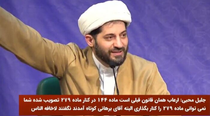 دکترای حقوق از دانشگاه امام صادق، تاکید کرد: ارعاب همان قانون قبلی است که ماده ۱۴۴ در کنار ماده ۲۷۹ تصویب شده و شما نمی توانید ماده ۲۷۹ را کنار بگذارید؛ یعنی هر چیزی که مجلس تصویب کرد و شورای نگهبان یا مجمع تشخیص مصلحت نظام تایید کرد، این شرع است و خلاف آن خلاف شرع است.