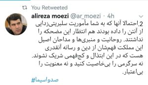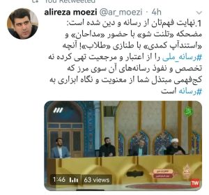 مبلغ/علیرضا معزی، معاون ارتباطات و اطلاعرسانی دولت حسن روحانی، در انتقاد از مدیریت رسانه ملی در روزهای پس از اعتراضات اخیر توییتی را منتشر نمود.