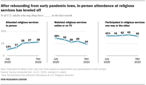 از آن زمان، کل سهم بزرگسالان امریکایی که در مراسم مذهبی شرکت میکنند کاهش قابل توجهی داشته و به حدود ۴ در ده رسیده است. اما از آنجایی که پاندمی کرونا دوره خود را گذرانده است و درهای عبادتگاههای زیادی به روی مردم باز شده است، درصد امریکاییهایی که عملاً در مراسم عبادی شرکت میکنند کاهش یافته است. اگر چه حضور فیزیکی افزایش داشته است. مثلاً در نوامبر ۲۰۲۲، میزان شرکت مجازی از ۲۷ به ۱۲ درصد رسیده و حضور فیزیکی از ۴ به ۱۶ درصد افزایش داشته است. ۱۲ درصد هم از شرکت به صورت توأمان گفتهاند.