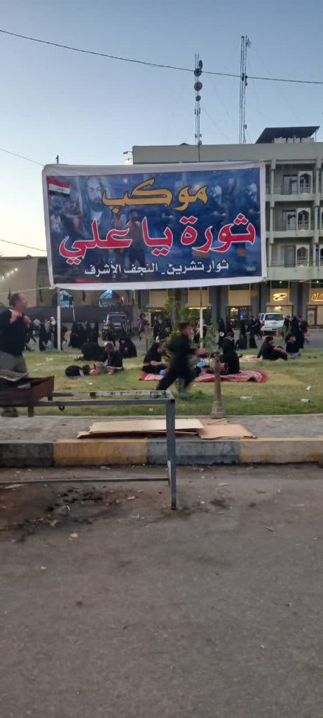 اما دو دلیل من را به تصمیمی رساند که پیشتر نوشتم؛ پیگیری یک سوژه اجتماعی در عراق اربعین. اول اینکه من در طول سال، بیشتر اوقاتم را در اتمسفر عراقی سپری میکنم و تا حدی میتوانم تفاوت های اربعین و غیر اربعین عراقی ها را تشخیص بدهم، دوم و افزون بر نکته اول هم اینکه عراق، عراق سیدالشهداست و از نظر من، یکی از راههای فهم میزان درونی بودن یک جنبش اجتماعی و درجه نهادینه شدگی آن در عمق جامعه عراق، سنجش نسبت آن با مفهوم عاشورا و مشایه اربعین است. بارها گفته ام و بعضاً نوشته ام که، تفاوت معترضان عراقی با معترضان در ایران، همین میزان وفاداری به اِلِمان های مذهبی است. این دو شبیه، در نسبتی که با مفهوم عاشورا بعنوان مرتفع ترین قله هویتیابی و الگوگیری تشیع برقرار میکنند، کاملا متفاوت از یکدیگر هستند. در فضای مجازی و حقیقی ایرانی های معترض، اندک بروزی از عاشورا نمیتوان دید؛ بالعکس عراقی ها که بشکل مصداقی اگر بخواهم بگویم، اربعین دو سال گذشته، صفحات و کانال های مجازی اصلی برای تشرینی ها[۱] در ایام اربعین، تماماً پر بود از نسبتیابی و ایجاد شباهت میان راه و هدف احرار جنبش تشرین با اباالاحرار عالم، حضرت سیدالشهدا علیه السلام؛ یعنی مبارزه با حکام فاسد. در شهر کربلا هم که موکب مستقل داشتند برای خودشان. نشان به آن نشان که درگیری نیروهای امنیتی با آنها برای جمعآوری موکبشان، غائله ای شد برای خودش. امسال هم که میدان ثوره عشرین نجف، جولانگاه بنرهایشان. این هم نمونه اش: