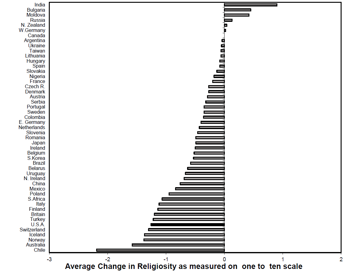 دکتر جانگ توضیح میدهد که امروزه رویکردهای جامعهشناختی مختلفی نسبت به سکولاریزاسیون وجود دارد. یک رویکرد این است که به نوعی نظریه را بازتعریف کنیم. به عنوان مثال رویکرد استیو بروس[۱۰] این است؛ او ادعا میکند اگر این نظریه را دوباره چارچوببندی کنیم، مشاهده میکنیم که با حقایق مطابقت دارد و شاید حتی پیشبینیهای جالبی برای آینده ارائه کند. از نظر جانگ این رویکرد، چندان جالب نیست. برای او رویکرد افرادی مانند پیپا نوریس[۱۱] و رونالد انگلهارت[۱۲] جالبتر است، که عبارت است از جمعآوری دادههای بیشتر و یا بررسی دادههای قدیمی با نگاهی جدید. انگلهارت یکی از بنیانگذاران پیمایش ارزشهای جهانی[۱۳] است که اکنون چند دهه از تأسیسش میگذرد. نوریس و انگلهارت نه تنها به تغییرات در طول زمان و بهویژه در سراسر جهان علاقمندند، بلکه به اینکه چگونه متغیرهای مختلف اجتماعی، سیاسی و اقتصادی تغییرات در ارزشها و باورها را پیشبینی میکنند نیز علاقه دارند. نموداری که در ادامه مشاهده میکنید، دادههای پرسش از اهمیت خدا در پیمایش ارزشهای جهانی را نمایش میدهد.