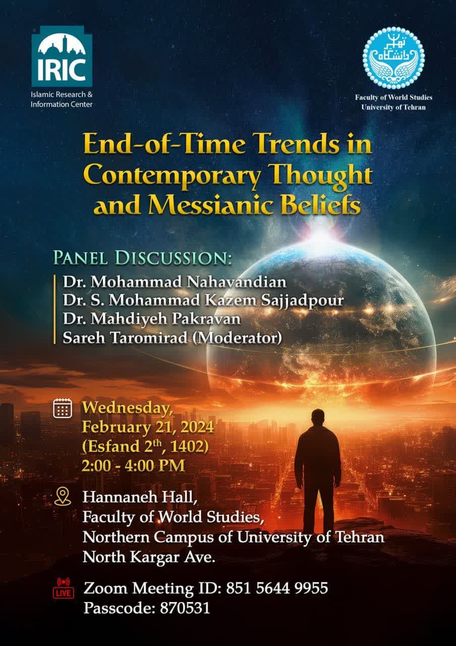 مبلغ/ مؤسسه اطلاعات و تحقیقات اسلامی (IRIC)) با همکاری دانشکده مطالعات جهان دانشگاه تهران، نشست علمی «موعودگرایی و گرایش های آخرالزمانی معاصر» را برگزار می کند.
