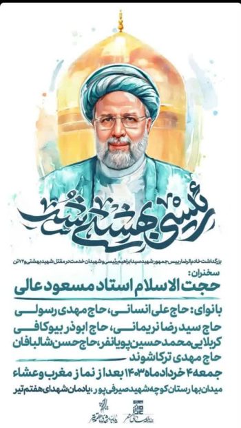 جمعه ۴ خرداد از نماز مغرب می توانید به مجلس بزرگداشت جامعه ایمانی مشعر در یادمان شهدای هفتم تیر بروید. استاد علی انسانی و ۶ مداح امشب برای مرثیه خوانی به یاد شهدای خدمت در این مجلس گردهم می آیند. به گزارش مبلغ، حجتالاسلام مسعود عالی در این مجلس سخنرانی خواهد کرد. همچنین مهدی رسولی، […]