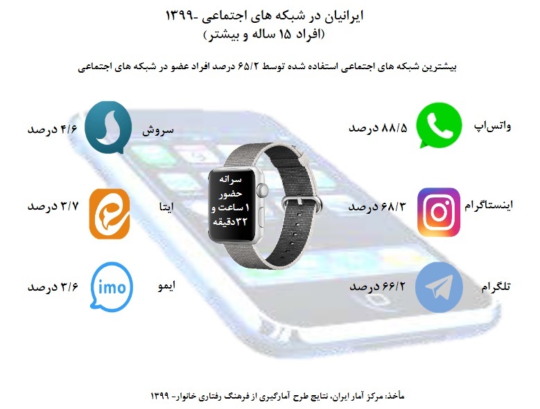 همچنین طبق آخرین اعلام مرکز آمار که از جامعه افرادی بالای ۱۵ سال کشور جمع آوری شده است، سرانه حضور هر ایرانی در شبکههای اجتماعی یک ساعت و سی و دو دقیقه است.