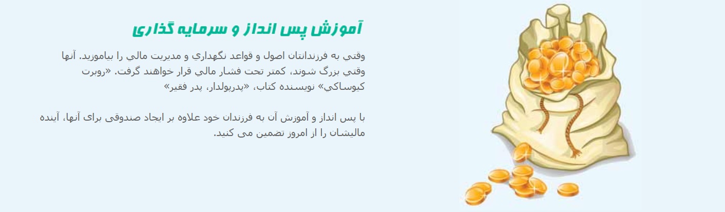 بنابراین قرار نیست که شما برای فرزندتان خانه و سرمایه به جا بگذارید، بلکه می بایست نحوه درست کار کردن و پس انداز کردن و سرمایه گذاری و در نهایت درست خرج کردن را به آنها آموزش دهید.