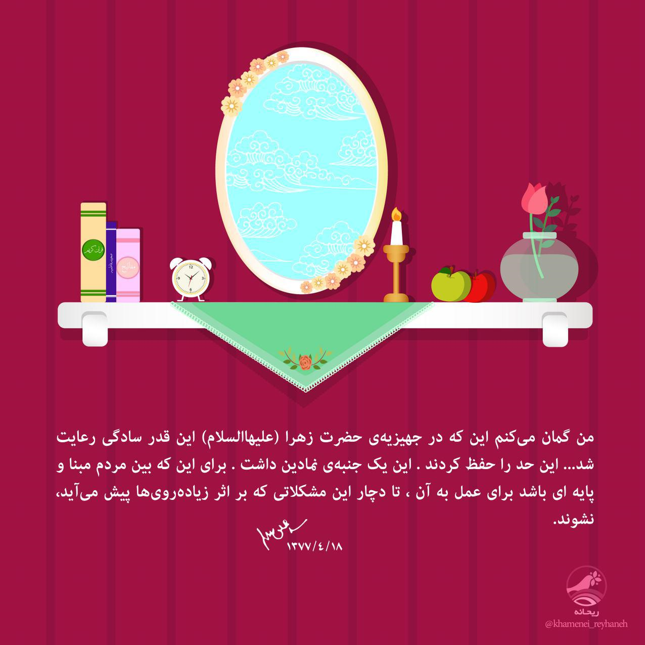 «من گمان میکنم اینکه در جهیزیهی حضرت زهرا (علیهاالسلام) این قدر سادگی رعایت شد… این حد را حفظ کردند. این یک جنبهی نمادین داشت. برای اینکه بین مردم مبنا و پایهای باشد برای عمل به آن، تا دچار این مشکلاتی که بر اثر زیادهرویها پیش میآید، نشوند.»