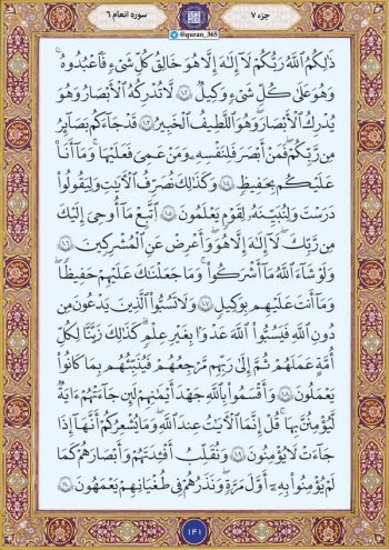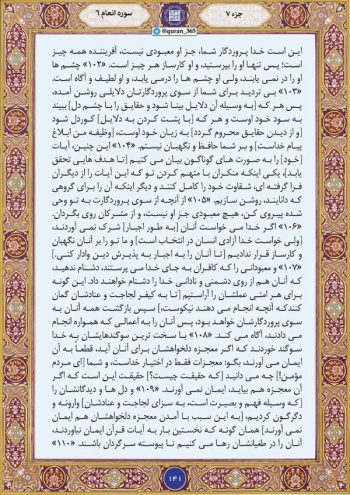 در تفسیر المیزان در شرح این آیه آمده است: خدا در این آیه بر اساس اینکه فطرت بشر همواره طالب دفاع از کرامت مقدساتش است، مؤمنان را امر به ادب دینی میکند تا با رعایت آن احترام مقدسات جامعه دینی محفوظ بماند و دستخوش اهانت و ناسزا یا تمسخر نشود.پس اگر مؤمنان بتهای مشرکین را دشنام دهند، تعصب جاهلی، مشرکان را وادار میکند که کرامت الوهیت را مورد تعرض قرار دهند، یعنی به خدای متعال ناسزا بگویند و در این صورت خود مؤمنین باعث هتک حرمت و جسارت نسبت به مقام کبریائی پروردگار شدهاند.در ادامه تلاوت ترتیل صفحه ۱۴۱ قرآن کریم شامل آیات ۱۰۲ تا ۱۱۰ سوره مبارکه انعام باصدای شهریار پرهیزکار تقدیم میشود.