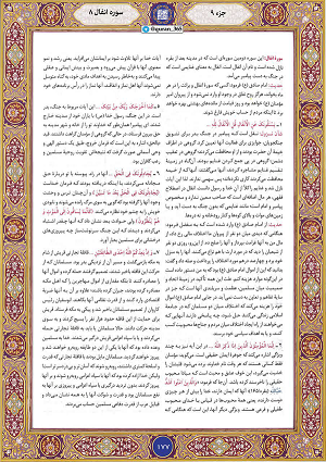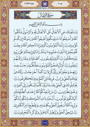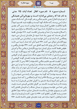 به گزارش پایگاه فکر و فرهنگ مبلغ،پیامبر(ص) میفرمایند: «اِذَا التَبَسَت عَلَیکُمُ الفِتَنُ، کَقِطَعِ الَّیلِ المُظلِمِ فَعَلَیکُم بِالقُرآنِ» هنگامی که فتنهها، همچون پارههای شب تاریک، شما را در خود پیچید، برشماست که به قرآن تمسک جویید. (اصول کافی ج۲ص۴۵۹)صفحه ۱۷۷ قرآن آغاز سوره انفال است، انفال به مالی میگویند که صاحب مشخصی ندارد و در صدر اسلام خاصه از غنیمتهای جنگی به عنوان انفال اسم برده میشد.