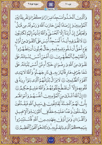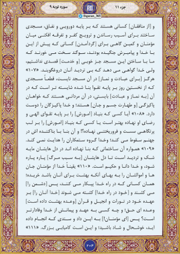 خدا سپس میفرماید که آیا کسی که بنیاد کار خود را بر پایه تقوا و رضای خدا نهاده بهتر است یا کسی که بنای خود را بر لب پرتگاهی فرو ریختنی نهاده و با آن در آتش دوزخ سرنگون میگردد؟ بدانید که خدا گروه ظالمان را هدایت نمیکند. آن بنایی که برافراشتند همواره به صورت شک و نفاقی در دلشان بر جای خواهد ماند، مگر این که دلهایشان پاره پاره شود و بمیرند.همانا خدا از مؤمنان جان و مالشان را به بهای بهشت خریداری کرد آنان در راه خدا میجنگند و میکشند و کشته میشوند این در تورات و انجیل و قرآن وعده حقی است که بر عهده خدا است و چه کسی از خدا به عهد خویش وفادارتر است! پس به این معاملهای که با خدا کردهاید شاد باشید و این همان کامیابی بزرگ است.در ادامه تلاوت ترتیل صفحه ۲۰۴ قرآن کریم شامل آیات ۱۰۷ تا ۱۱۱ سوره مبارکه توبه با صدای شهریار پرهیزکار تقدیم میشود.