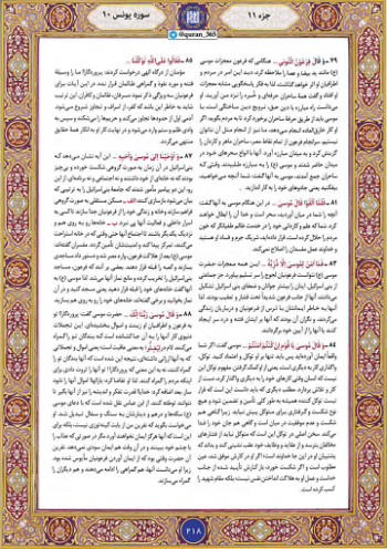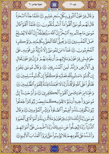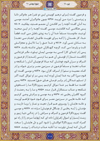 بنابر روایت فارس، صفحه ۲۱۸ قرآن آیات سوره یونس به ماجرای موسی(ع) و ساحران اشاره میکند و میفرماید که فرعون برای شکست دادن حضرت موسی همه ساحران را فراخواند. این اتفاق برای این بود که وقتی فرعون معجزات موسی علیه السلام را دید دریافت که حتما روی مردم اثر میگذارد، پس به فکر تلافی و مقابله افتاد.