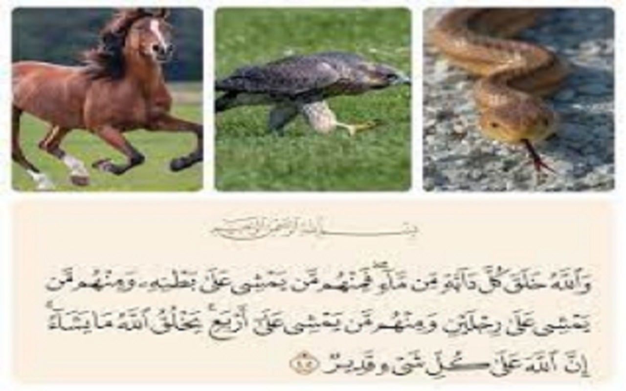 «﴿وَ اَللّٰهُ خَلَقَ کُلَّ دَابَّهٍ مِنْ مٰاءٍ فَمِنْهُمْ مَنْ یَمْشِی عَلىٰ بَطْنِهِ وَ مِنْهُمْ مَنْ یَمْشِی عَلىٰ رِجْلَیْنِ وَ مِنْهُمْ مَنْ یَمْشِی عَلىٰ أَرْبَعٍ یَخْلُقُ اَللّٰهُ مٰا یَشٰاءُ إِنَّ اَللّٰهَ عَلىٰ کُلِّ شَیْءٍ قَدِیرٌ؛﴾ (۱) و خدا هر جنبدهای را از آبی آفرید، پس گروهی از آنها بر شکمشان راه میروند و برخی از آنها به روی دو پا حرکت میکنند و بعضی از آنها بهروی چهارپا راه میروند. خدا آنچه را بخواهد میآفریند؛ مسلماً خدا بر هر کاری تواناست.»