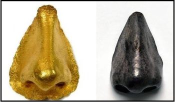۵- در خصوص نحوۀ نصب این پروتز فلزیِ مخصوص در ناحیۀ بینی، صفحات تاریخ سکوت کرده است و از آن ها اطلاعات خاصی از کیفیت نصب و استقرار پروتز بر روی صورت به دست نمی آید. آیا آن را به وسیلۀ چیزی مثل نخ، کِش یا طنابی ظریف به دور سر پیچیده تا بدین نحو پروتز یاد شده در موضع دقیق بینی نصب گردد یا چسب مخصوصی در آن ایام بوده و آن را در موضع آسیب دیده می نهادند و سپس پروتز بینی را روی آن چسبانده و کار می گذاشتند یا آن که پروتز فلزی را به گونه ای می ساختند که دارای زائده هایی باشد و آن زائده ها را داخل در منافذ یا استخوان های صورت در ناحیۀ بینی نصب می کردند و بدین ترتیب پروتز در جای مناسب خود قرار می گرفت؟
