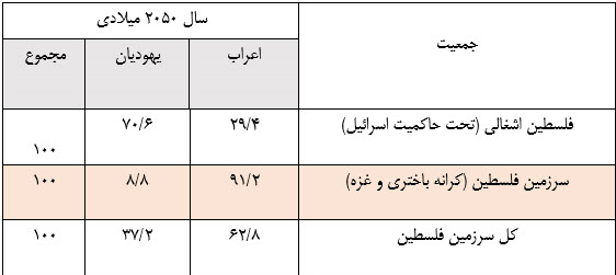همانطور که گفته شد آمارها نشان از حفظ ترکیب جمعیتی فلسطین به نفع فلسطینیان دارد. در جدول زیر طبق اداره مرکزی آمار رژیم صهیونیستی، جمعیت فلسطینیها در سال ۲۰۵۰ با تمامی تلاشهای سران تل آویو ۶۲.۸ درصد کل سرزمین فلسطین را تشکیل خواهد داد.