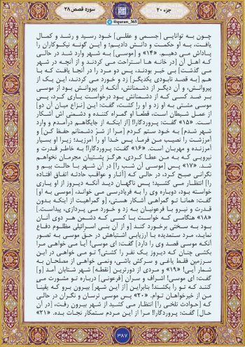 بنابر روایت فارس، قرآن در آیه ۱۴ با تعبیری دقیق میفرماید که موسی به «اشدّ» و «استواء» رسید، یعنی هم از نظر جسمی و هم از نظر فکری به پختگی لازم دست یافت. این بلوغ، مقدمه دریافت حکمت و علم الهی است. نکته مهم اینجاست که این عطای الهی بیمقدمه نیست، قرآن تصریح میکند که این پاداش نیکوکاران است. از همان آغاز، رابطهای روشن میان تقوا، عمل صالح و دریافت بصیرت الهی ترسیم میشود.