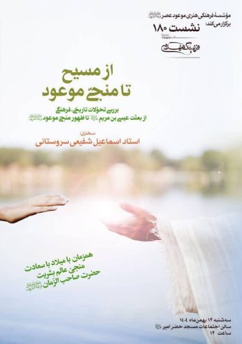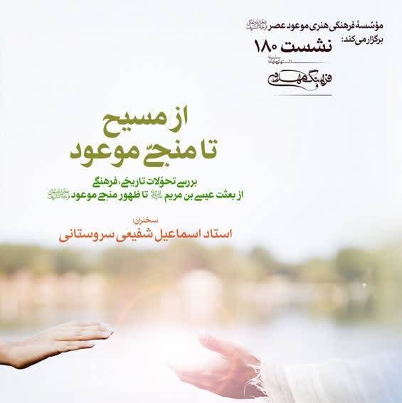 یکصد و هشتادمین نشست از سلسله نشست های ماهانه فرهنگ مهدوی با عنوان از مسیح تا منجی موعود با سخنرانی اسماعیل شفیعی سروستانی در سالن اجتماعات مسجد امیر برگزار می شود.